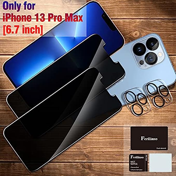 True 28° Privacy Protection: Ferilinso Privacy Coatings made of new materials from germany, have better Privacy performance than other materials. the screen is only visible to persons directly in front of the iPhone 13 Pro Max 6.7 inch screen and does not affect power. Keeps your personal, private, and sensitive information hidden from strangers, Provides the most powerful protection, even your friends or colleagues sitting next to you also can't see on your messages. Shatterproof and Scratch-Resistant: Ferilinso Privacy Glass made of 9H super strong military explosion-proof glass, and the strengthened edge design ensure the corners of the screen are protected well. which not only shock-proof, also protecting your screen from scratches to high impact drops. The phone is placed in the bag without worrying about being scratched by sharp objects such as keys. Frontal 99.99% HD & Sensitive Touch: Ferilinso Privacy Glass screen protector break through the defects of the blurred picture of the privacy glass films on the market, highly restore the best visual feast brought by the iPhone screen. 0.33mm ultra-thin tempered glass maintains excellent responsiveness sensitivity touch make you feel nothing on screen. Hydrophobic and oleo-phobic coating make it anti-fingerprint and dirt- proof, giving you a ultimate bare-screen touch. Camera Protector & Case-Friendly: Ferilinso camera protector made of 9H glass effectively protect entire lens from drops, scratches, other accidents and not easy to fall off. Special designed Black circle compatible night shooting function, brings you the original of beauty to every photo and video. This camera and screen protector designed to be compatible with most cases. Extra slight space around the bezel allows your case to wrap around the edge of your device without any interference. Face ID Compatible & Easy To Install: Precisely cut for iPhone 13 Pro Max 6.7 inch, this Privacy Glass does not interfere with the Face ID feature. Comes with precision installation frame and complete cleaning kit accessories, made the install very easy. We are committed to providing good service to every customer, whatever problems, You can send us information through Amazon's Message Center, we will provide you with satisfactory service within 24 hours.